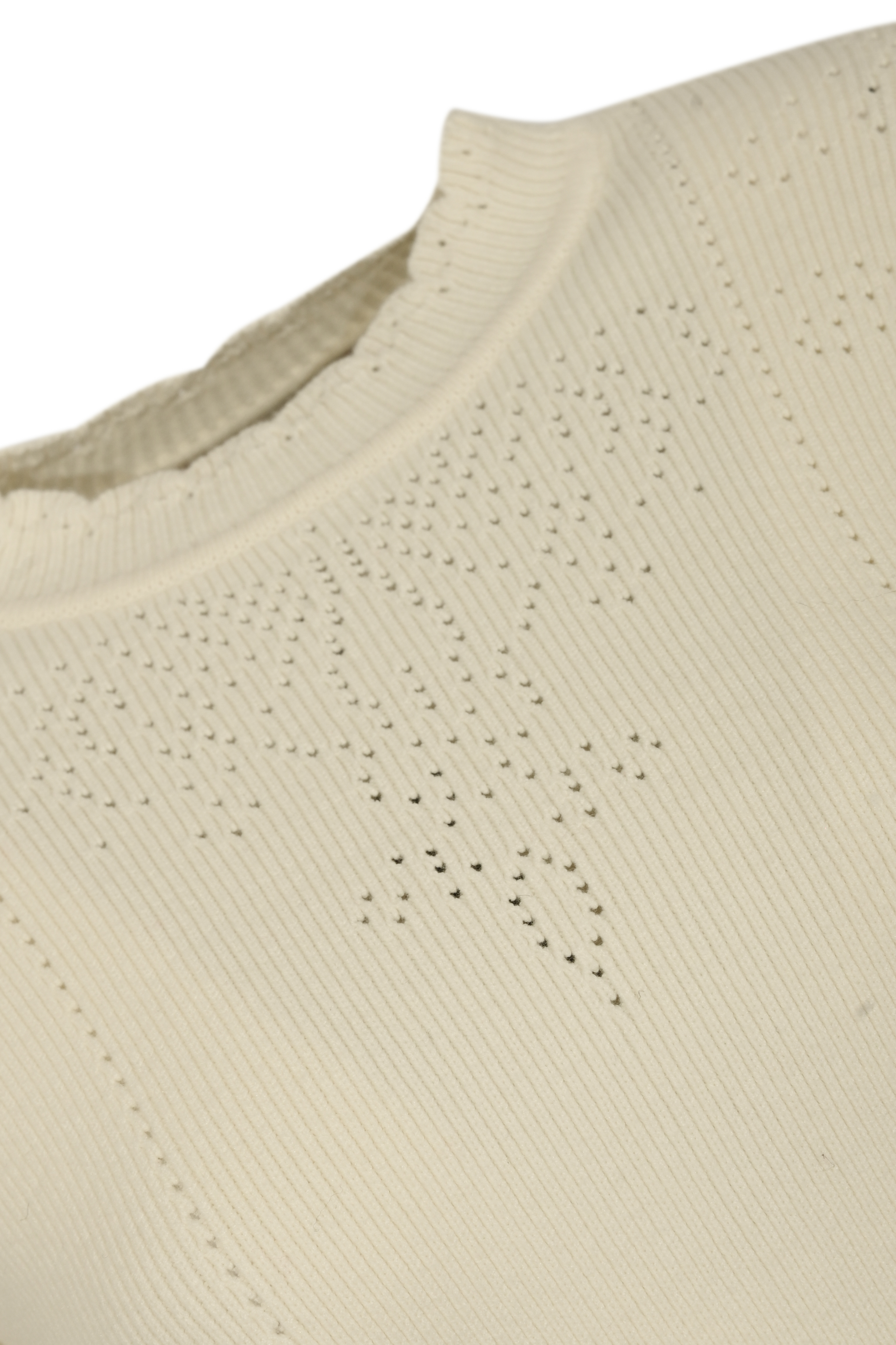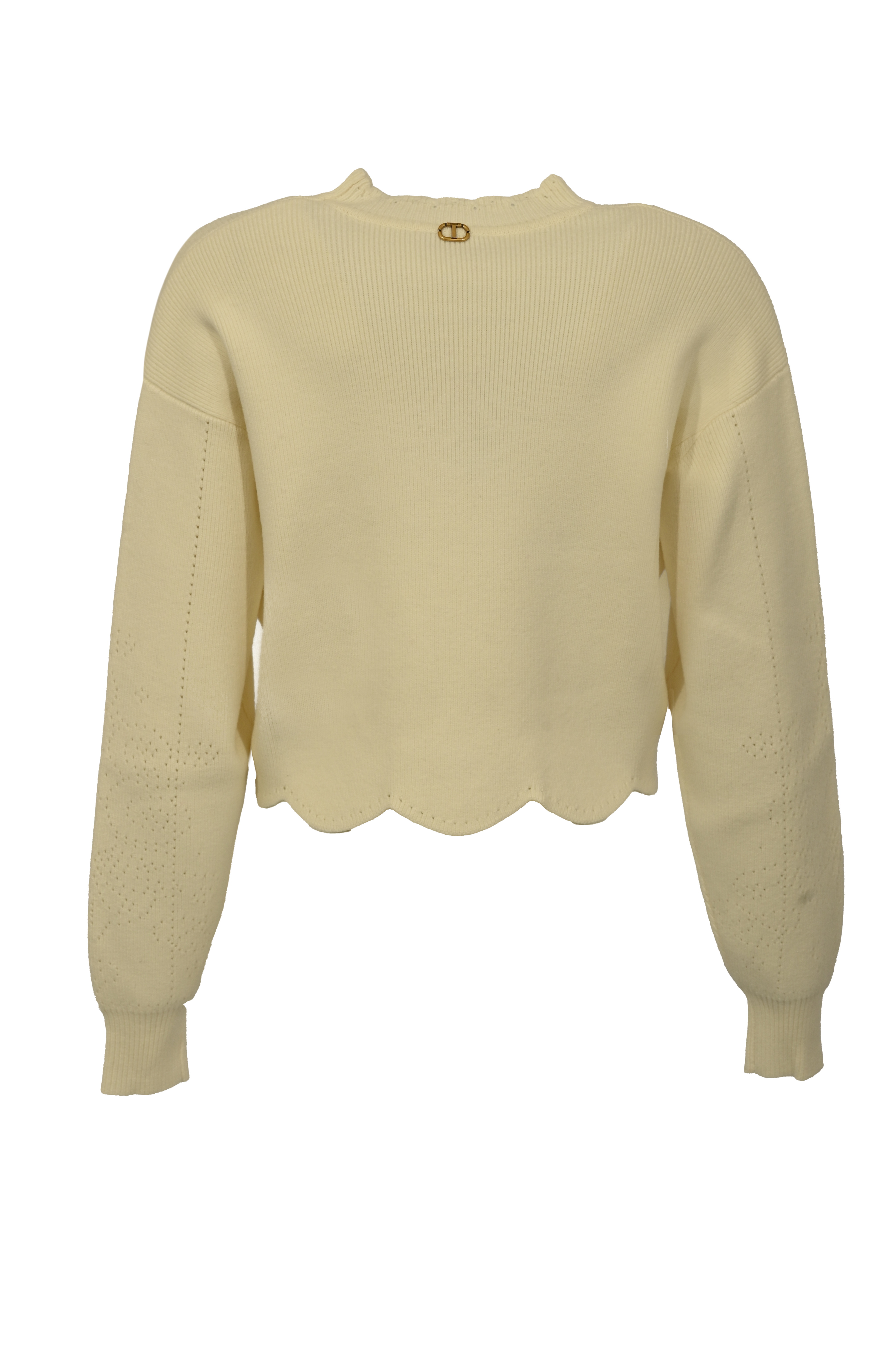 - Dettagli: bordo smerlato, lavorazione traforata sul davanti e sulle maniche, logo metallico sul retro