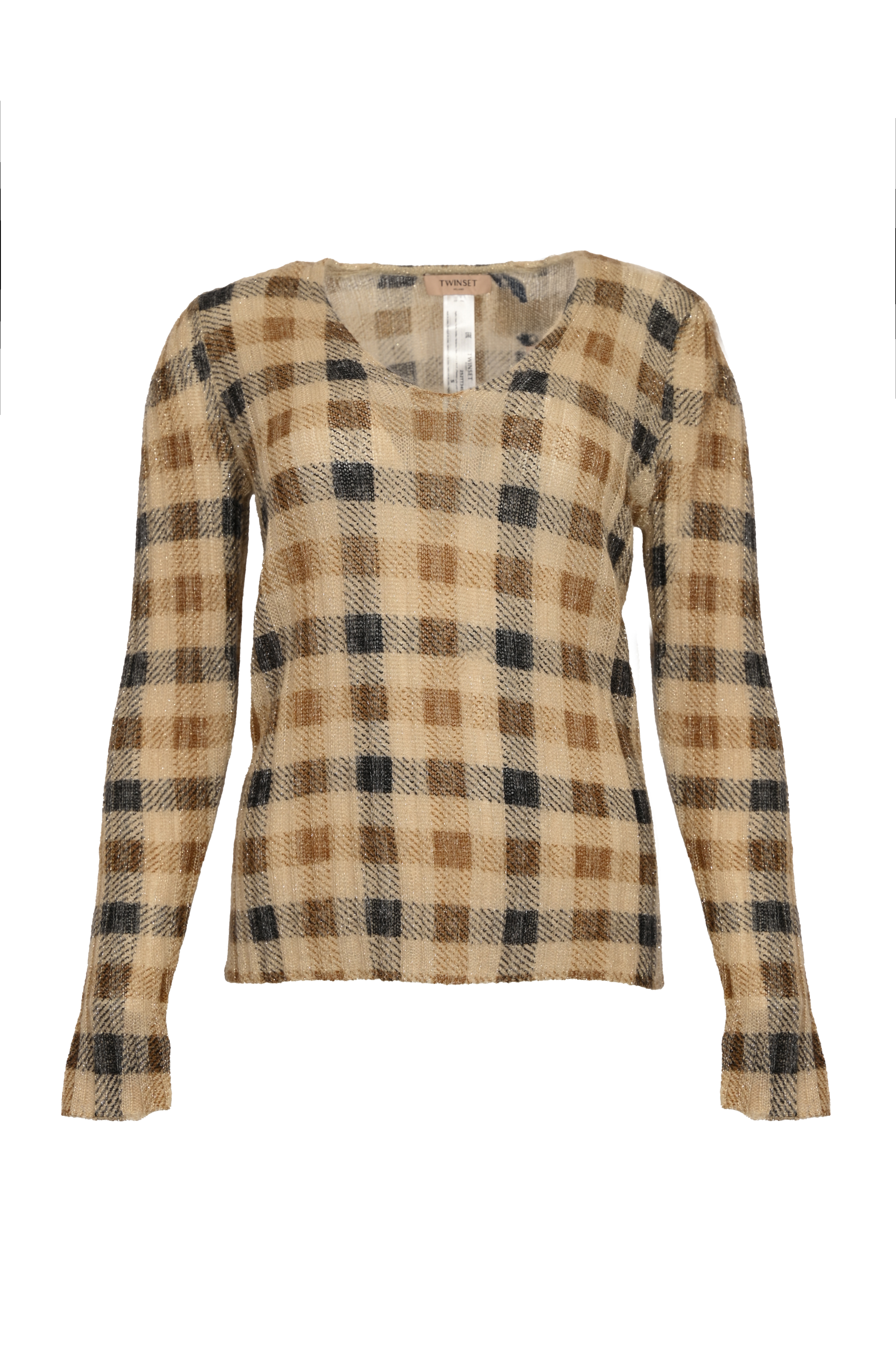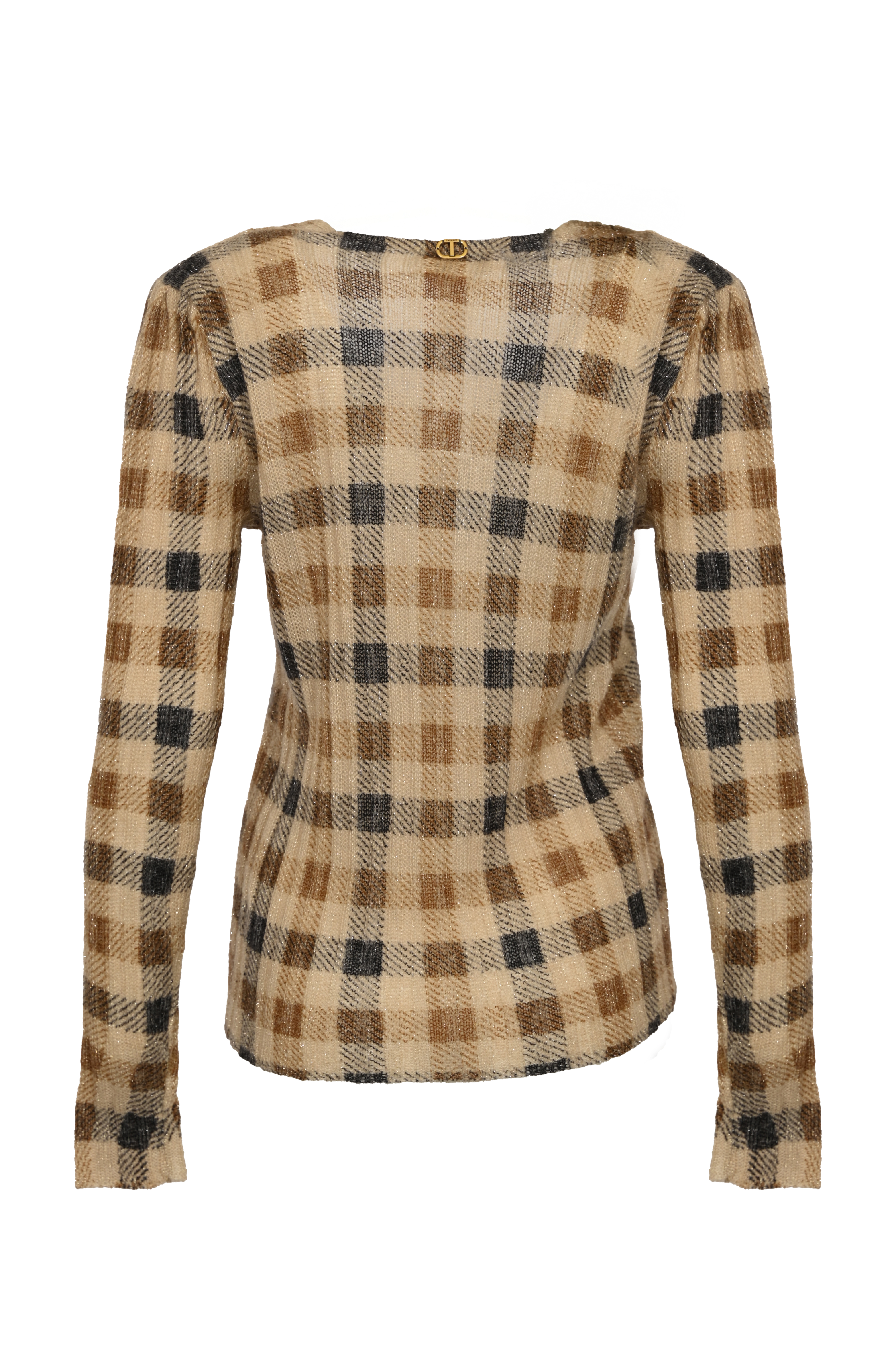 - Dettagli: lavorazione semi-trasparente con effetto peloso, finiture a costine su fondo e polsi, piccolo logo metallico dorato sul retro