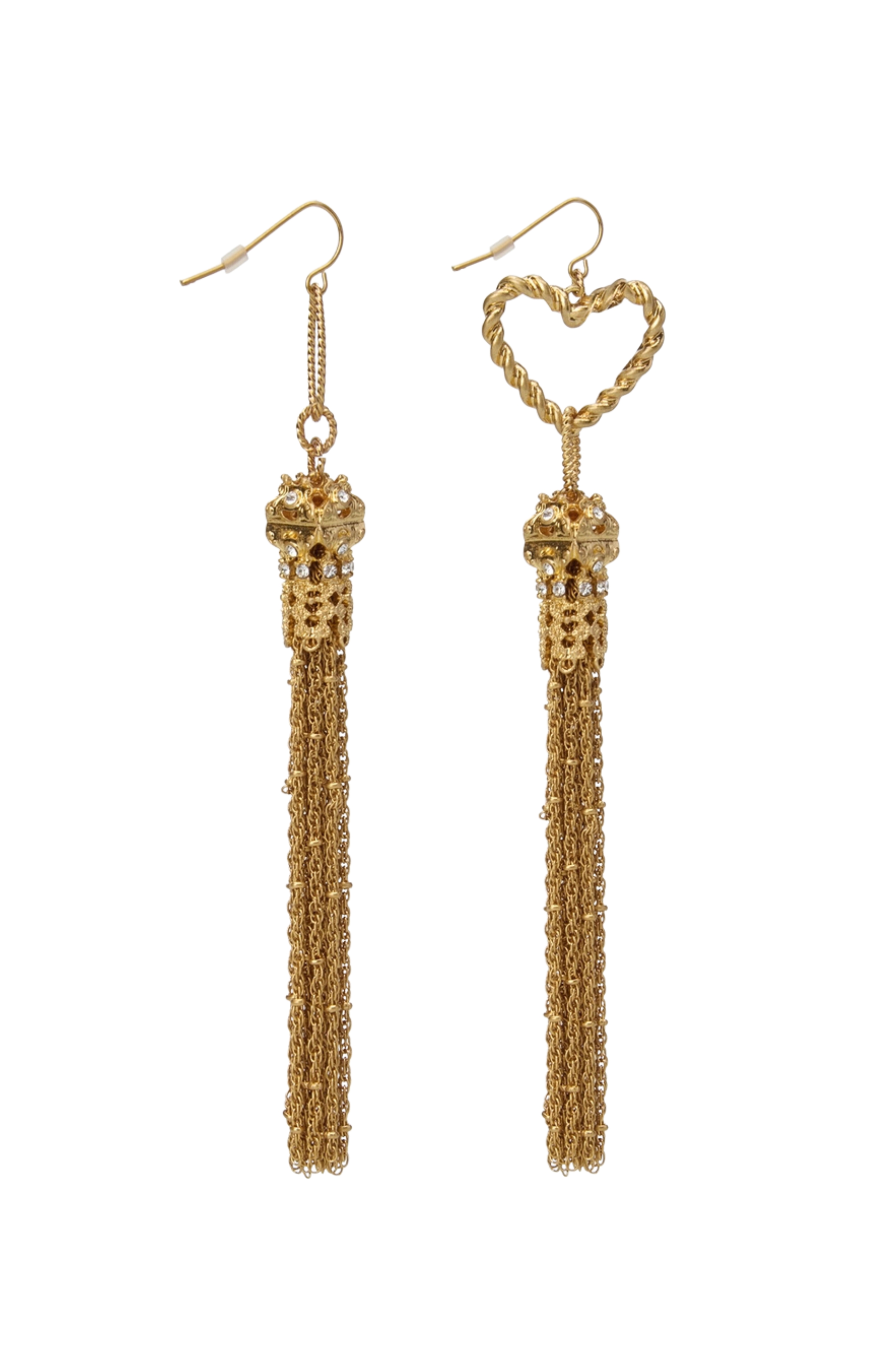 - Dettagli: Design asimmetrico con charm decorativi, uno dei quali a forma di cuore intrecciato; frange in catena sottile e pendente lavorato con punti luce