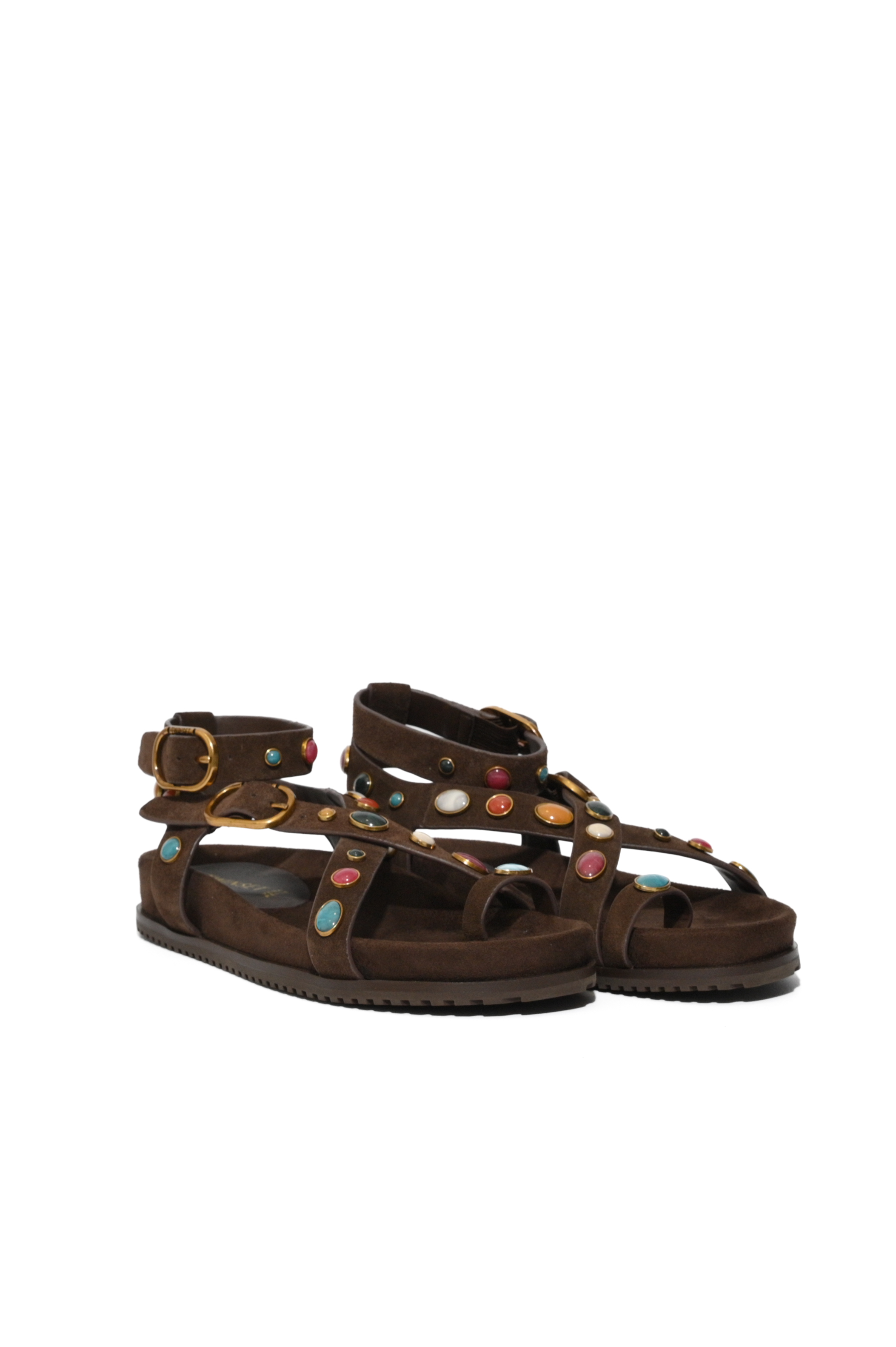 - Tomaia: camoscio con fasce incrociate decorate da borchie multicolor