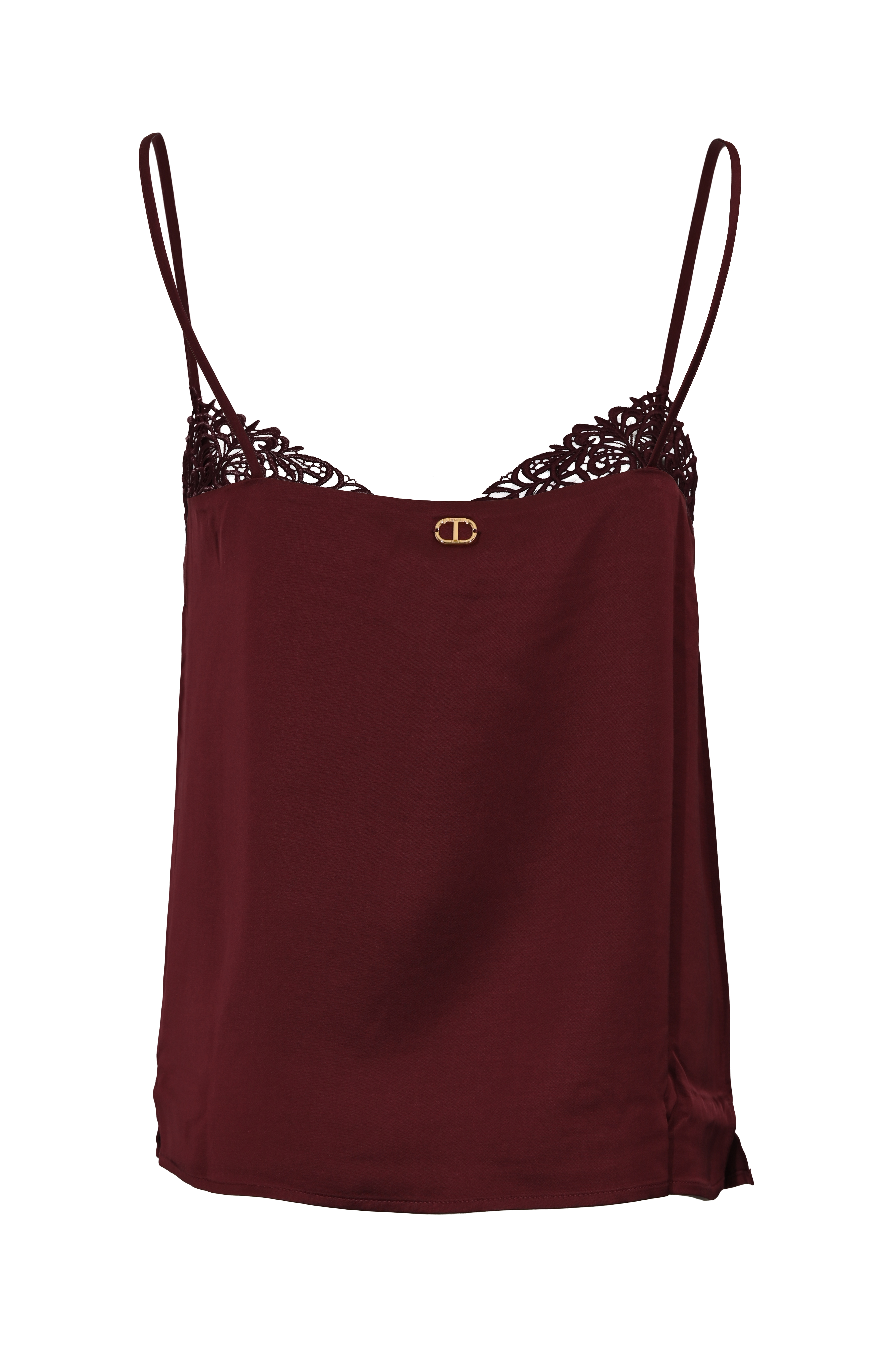 - Dettagli: bordo in pizzo ricamato sul décolleté, piccolo logo metallico sul retro, linea elegante e femminile