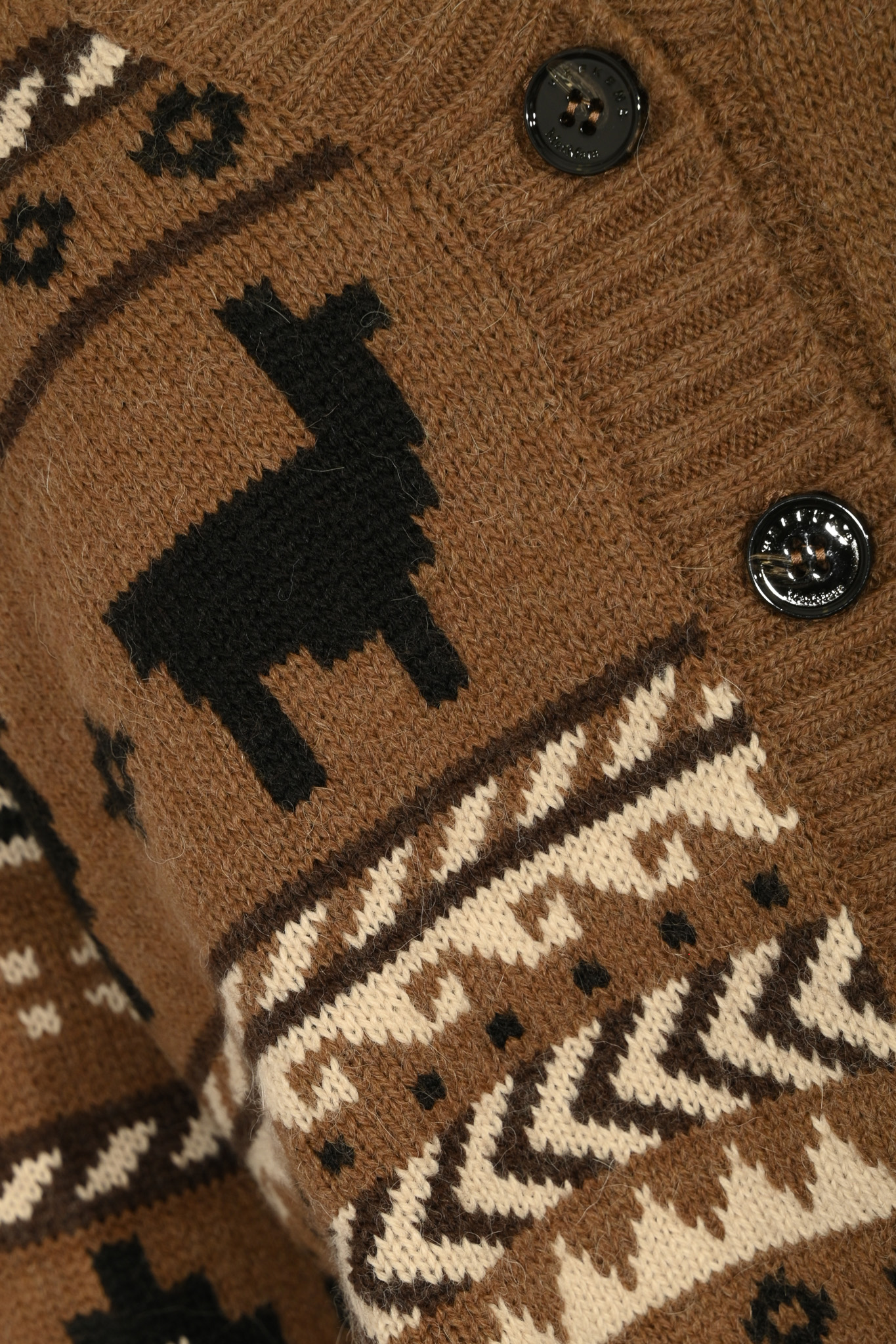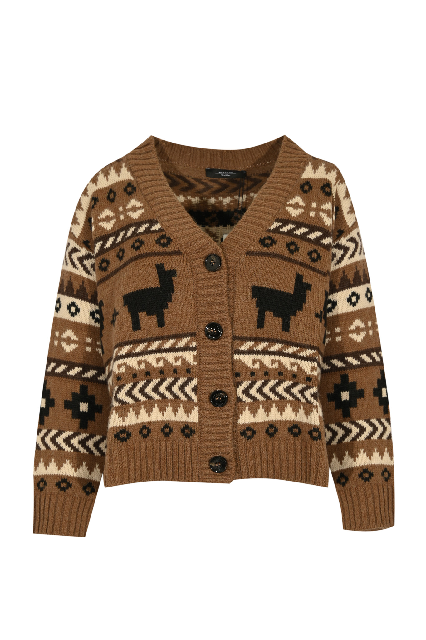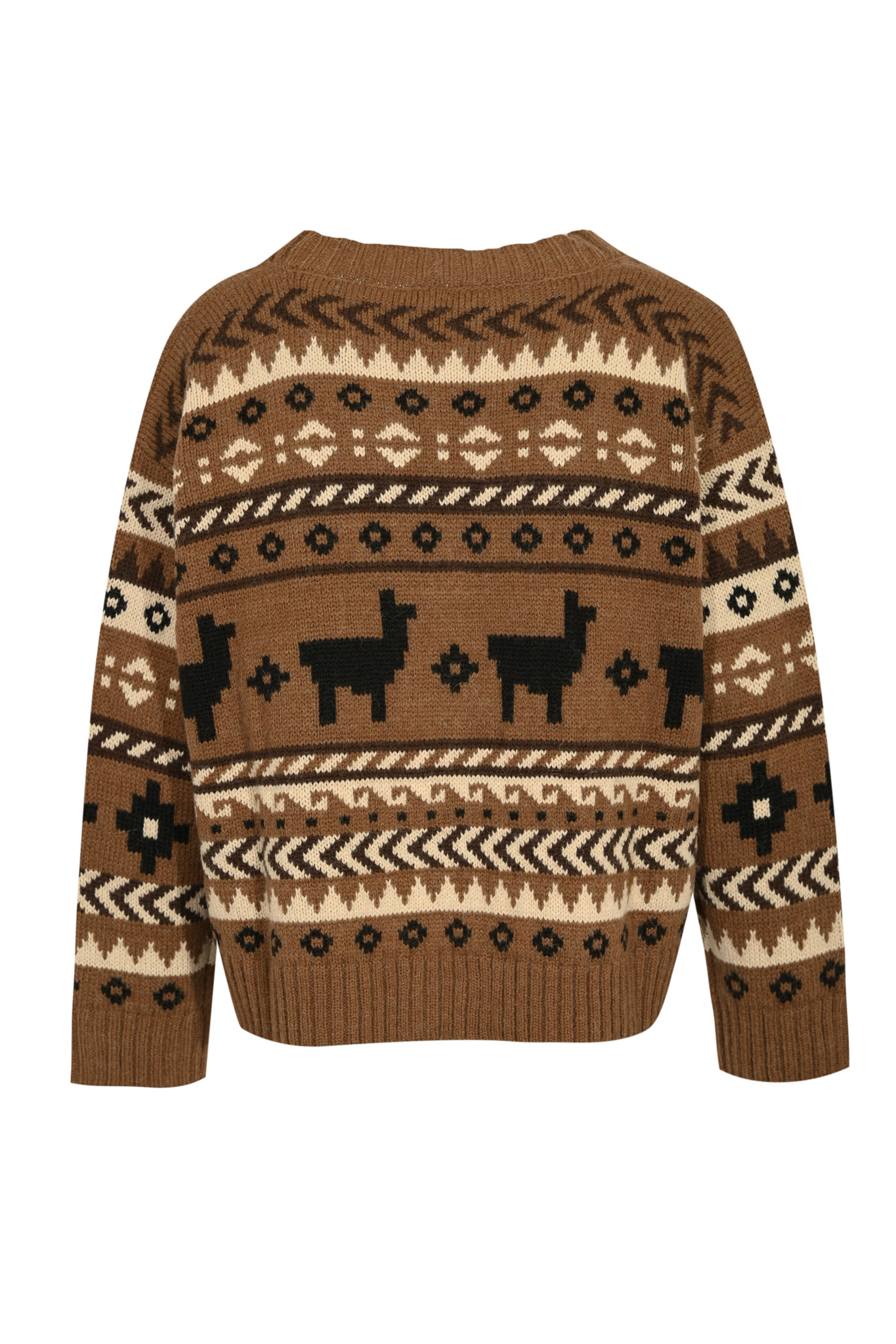 - Fantasia: jacquard con motivi geometrici e figure di alpaca nei toni cammello, marrone e nero