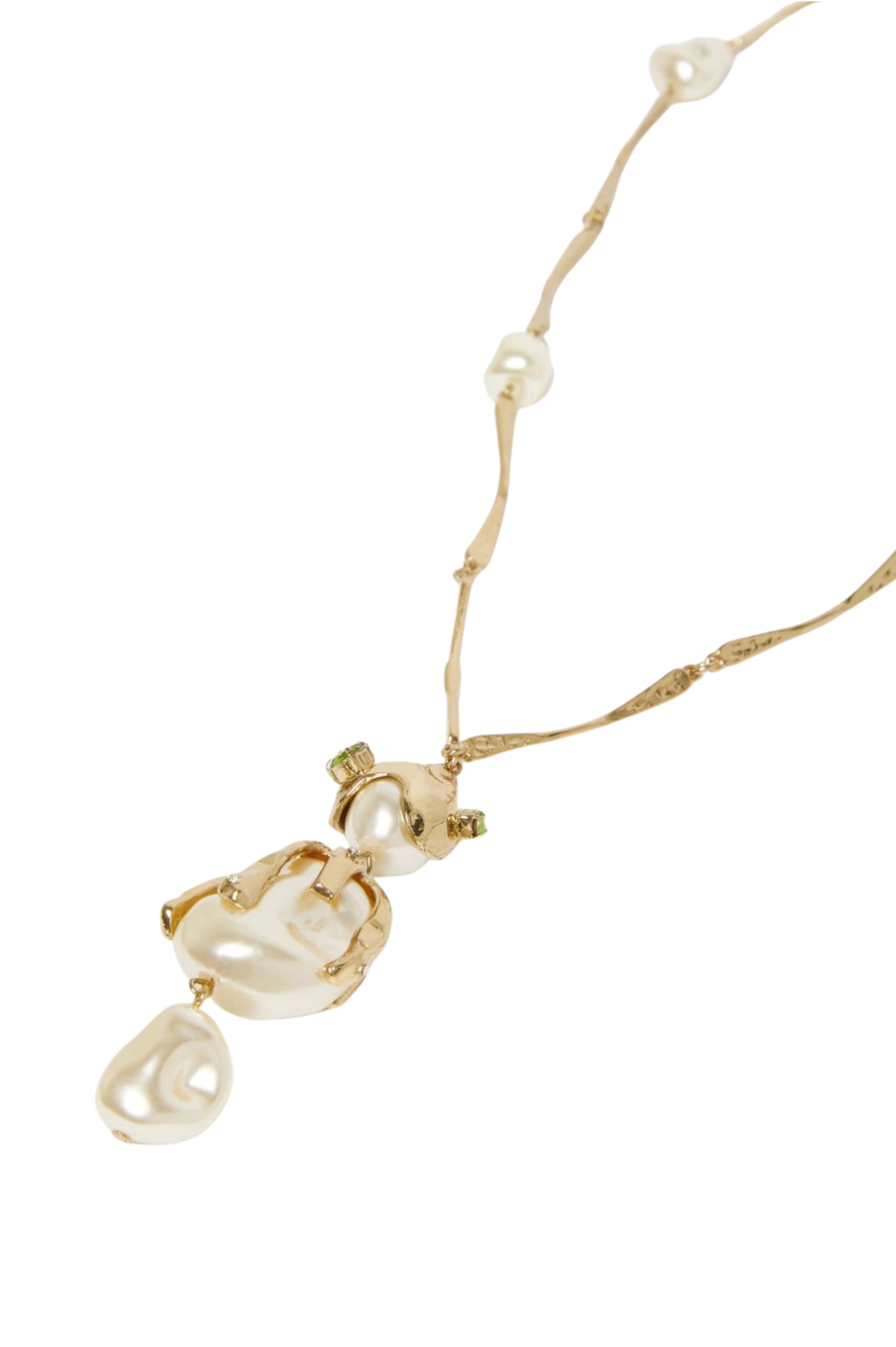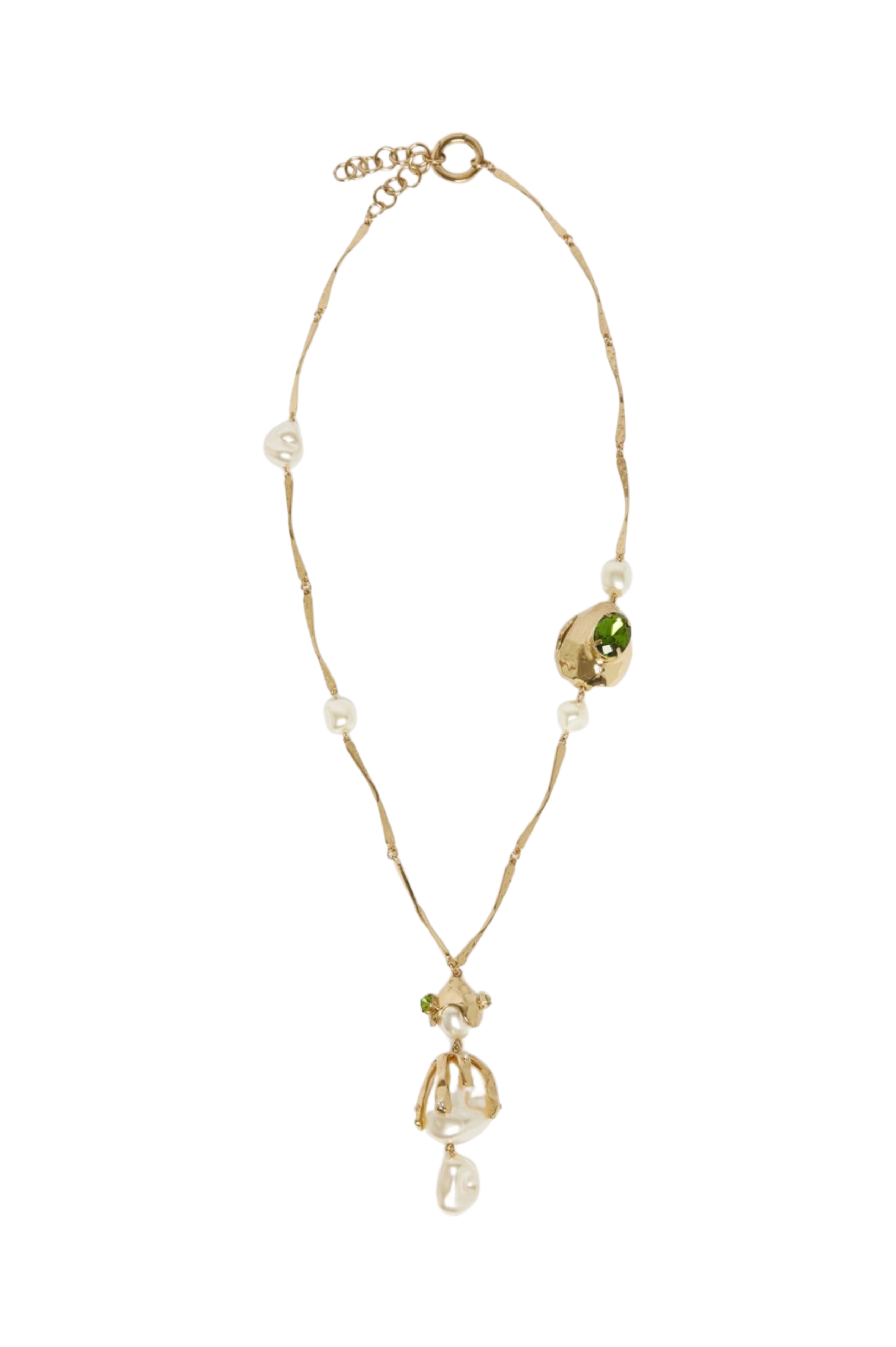 - Dettagli: collana corta con catena martellata e perle irregolari, arricchita da un grande ciondolo pendente composto da elementi scultorei e cristalli colorati per un effetto elegante e contemporaneo