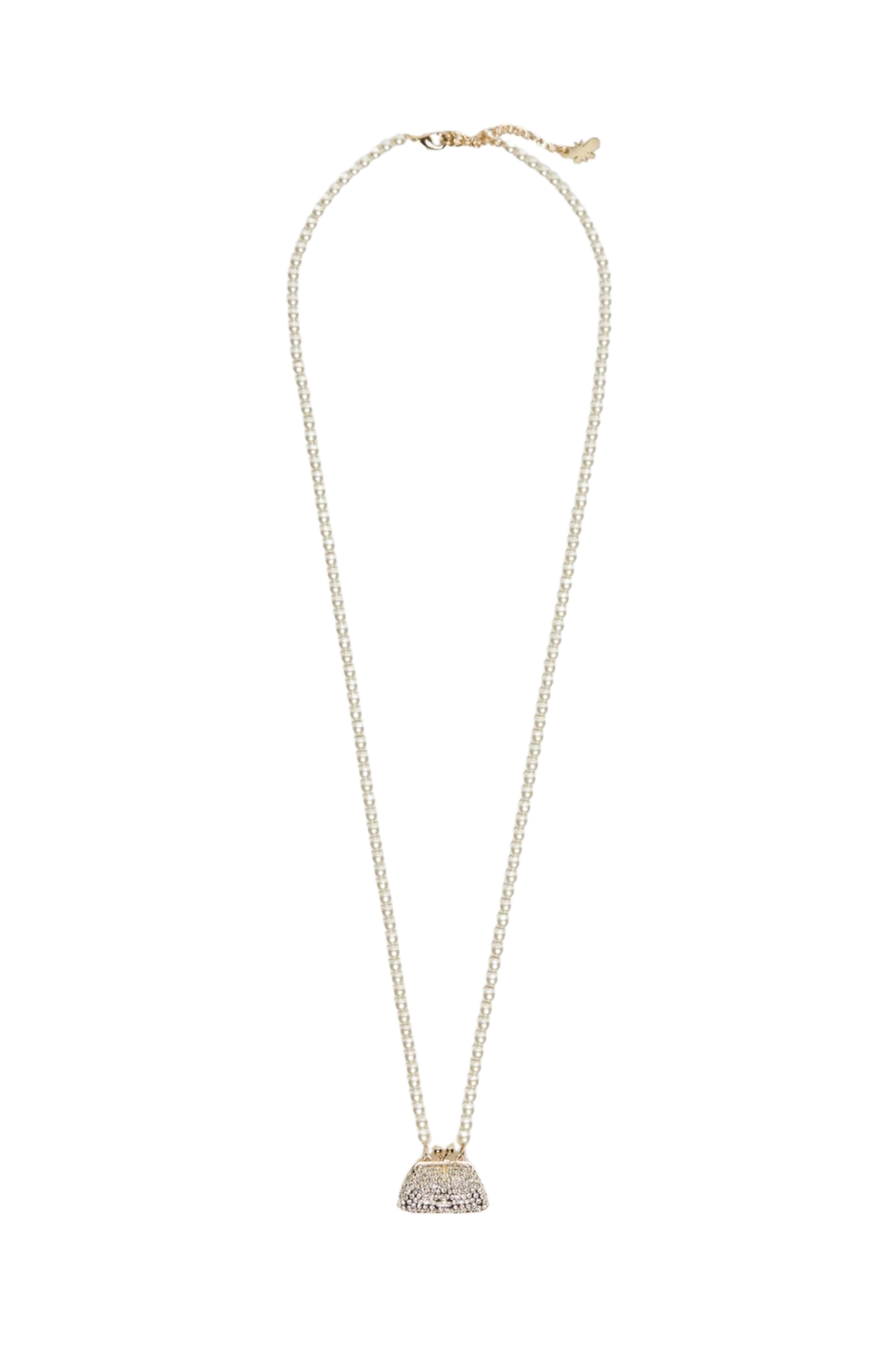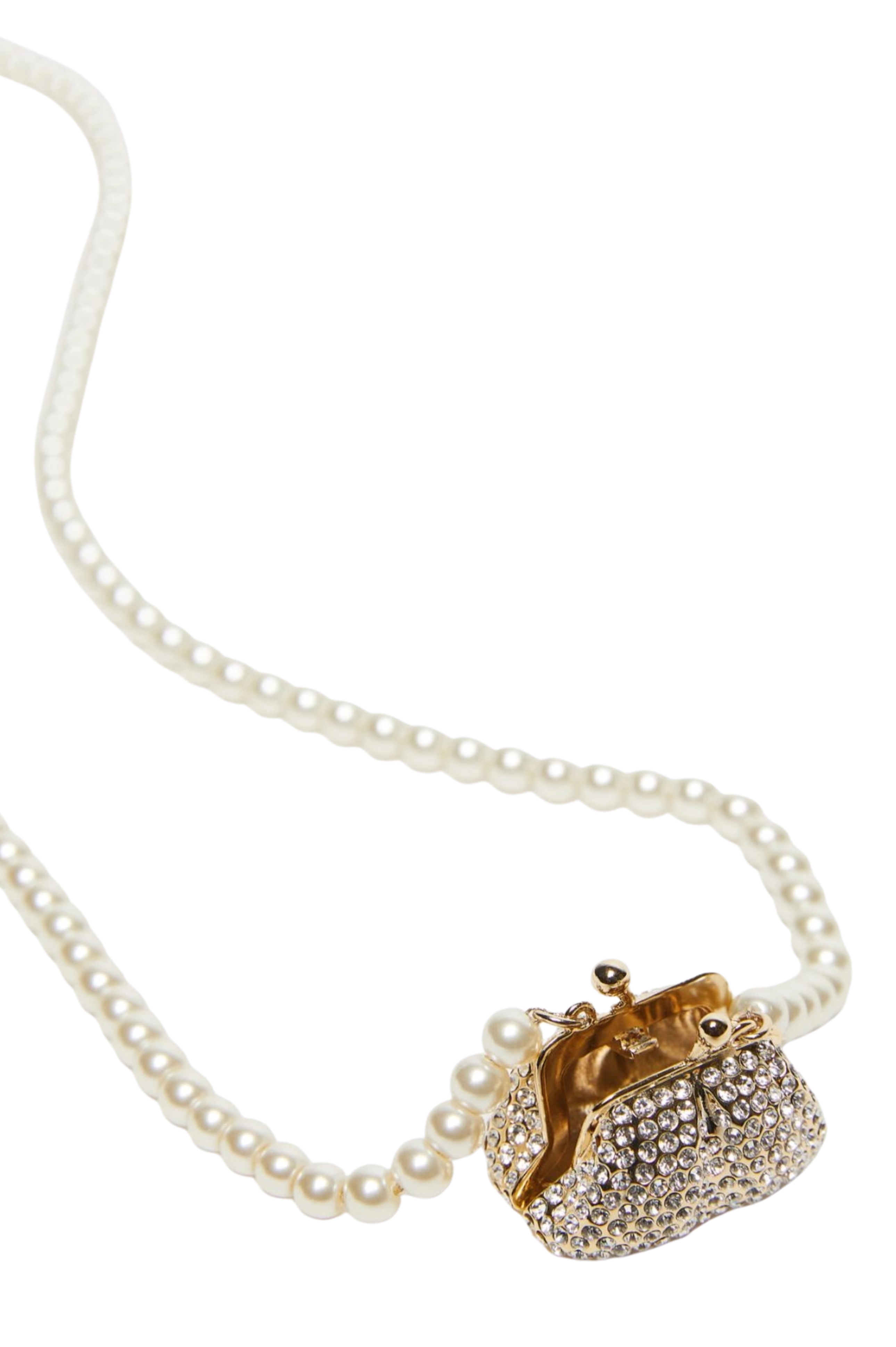 - Dettagli: collana con catena di perle e ciondolo a forma di mini Pasticcino Bag impreziosito da strass, ispirata alliconica borsa del brand, elegante e ironica allo stesso tempo