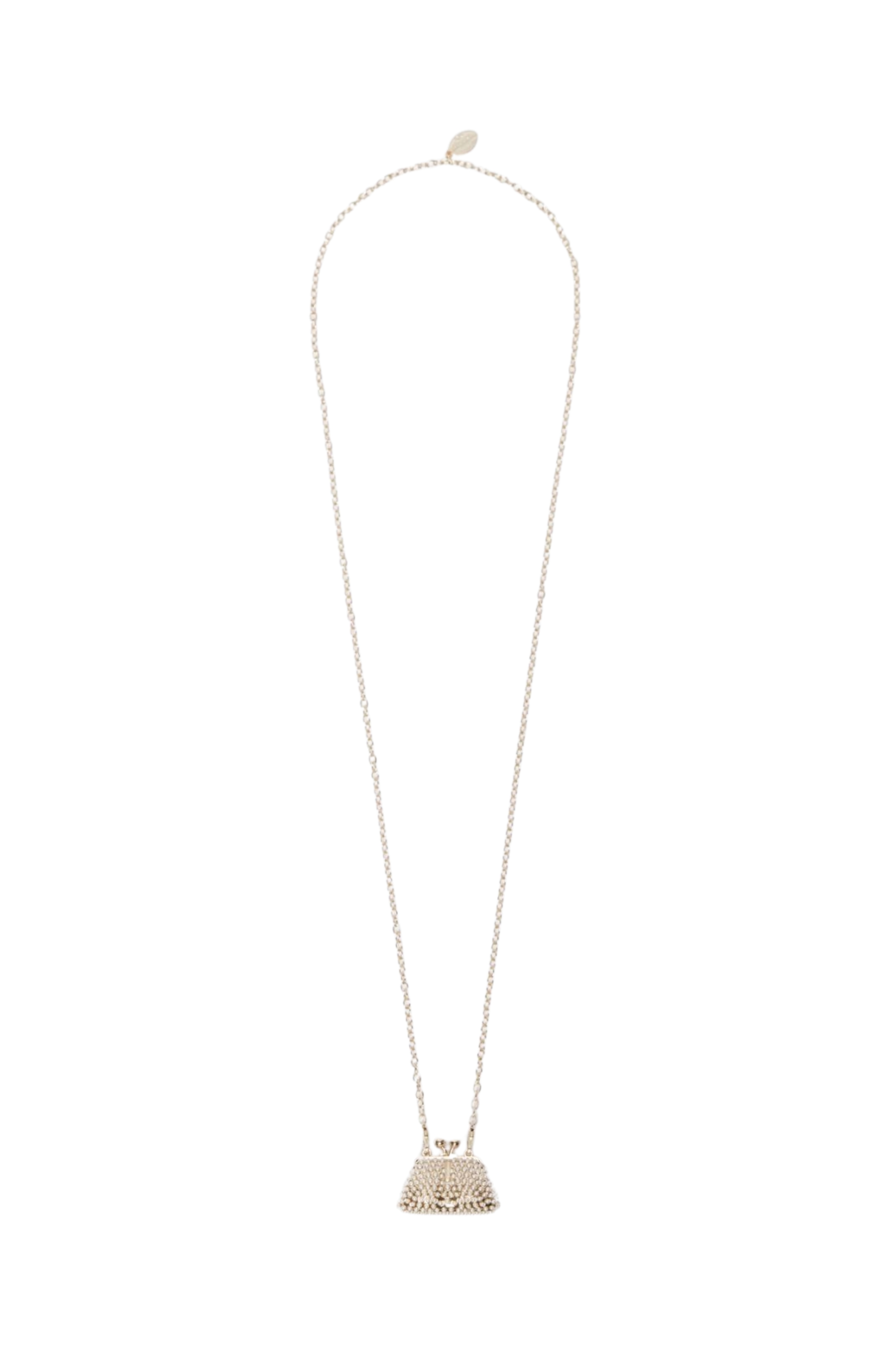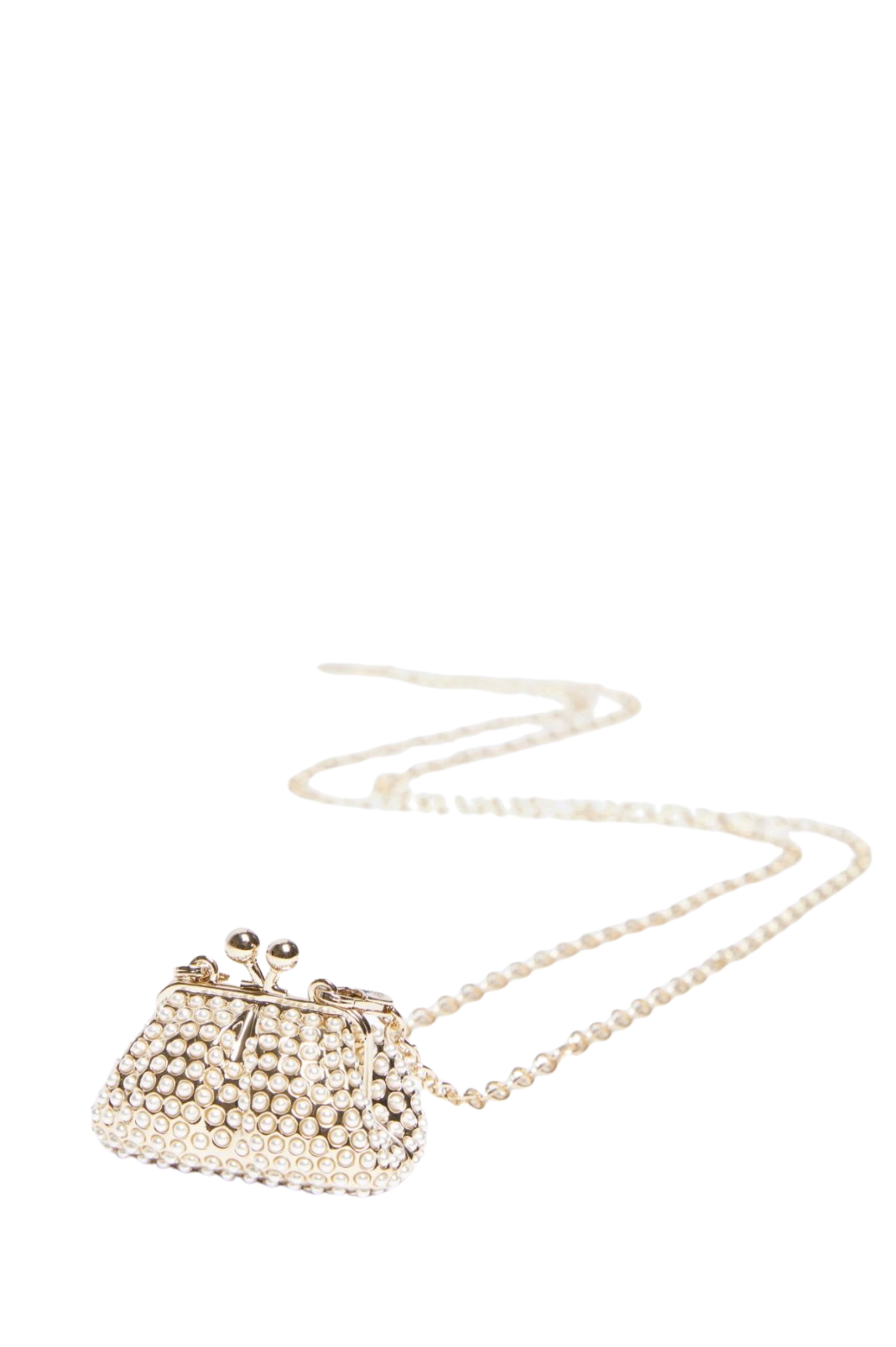 - Dettagli: collana lunga con catena sottile e ciondolo a forma di borsetta Pasticcino, completamente rivestito di microperle. Un accessorio iconico e raffinato, perfetto per aggiungere un tocco glamour al look