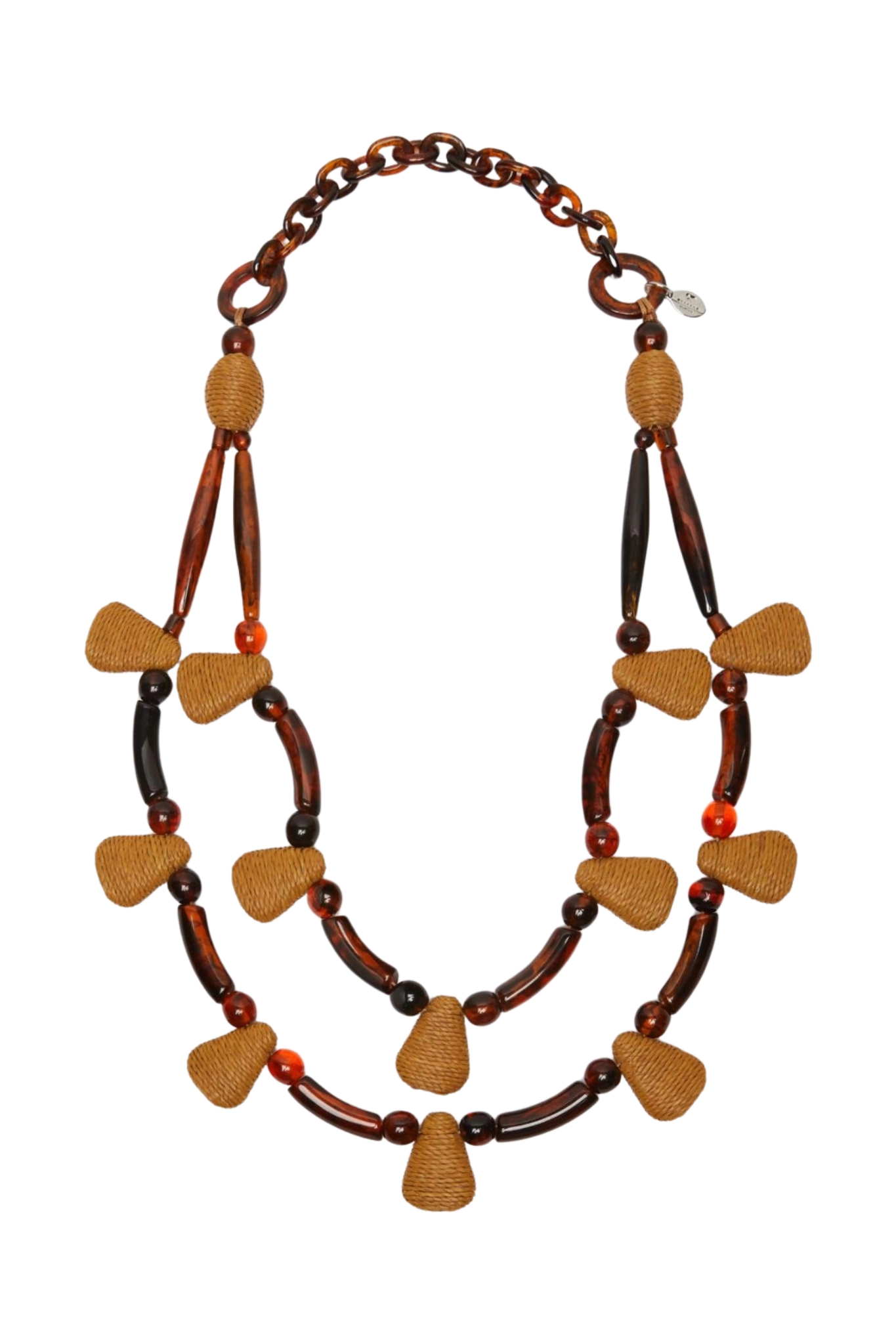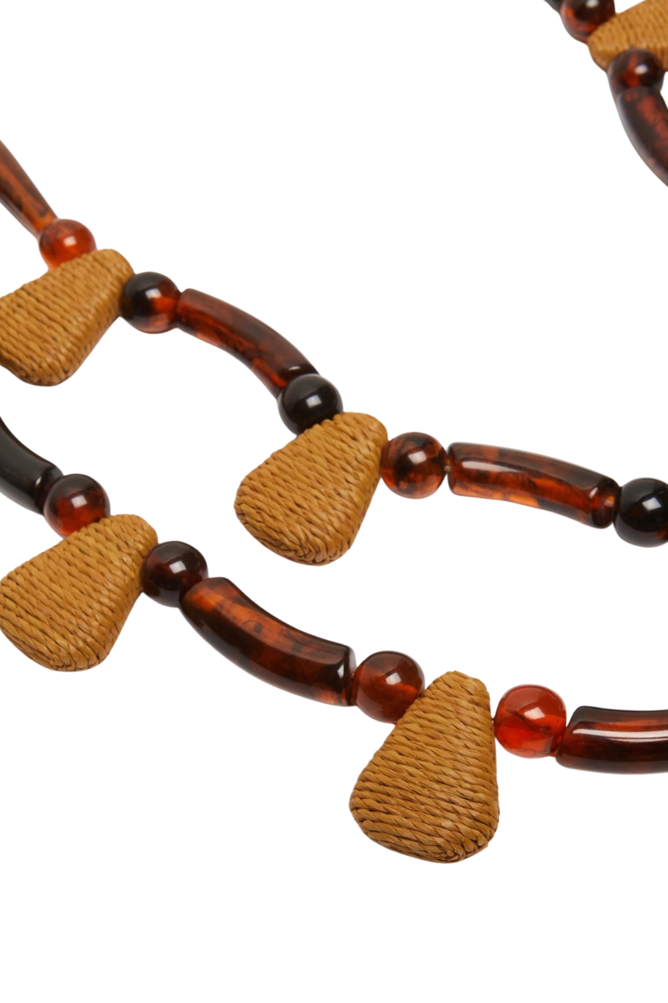 - Dettagli: collana a doppio giro con elementi decorativi in resina effetto ambra alternati a inserti rivestiti in rafia, design voluminoso e materico, targhetta finale con logo inciso