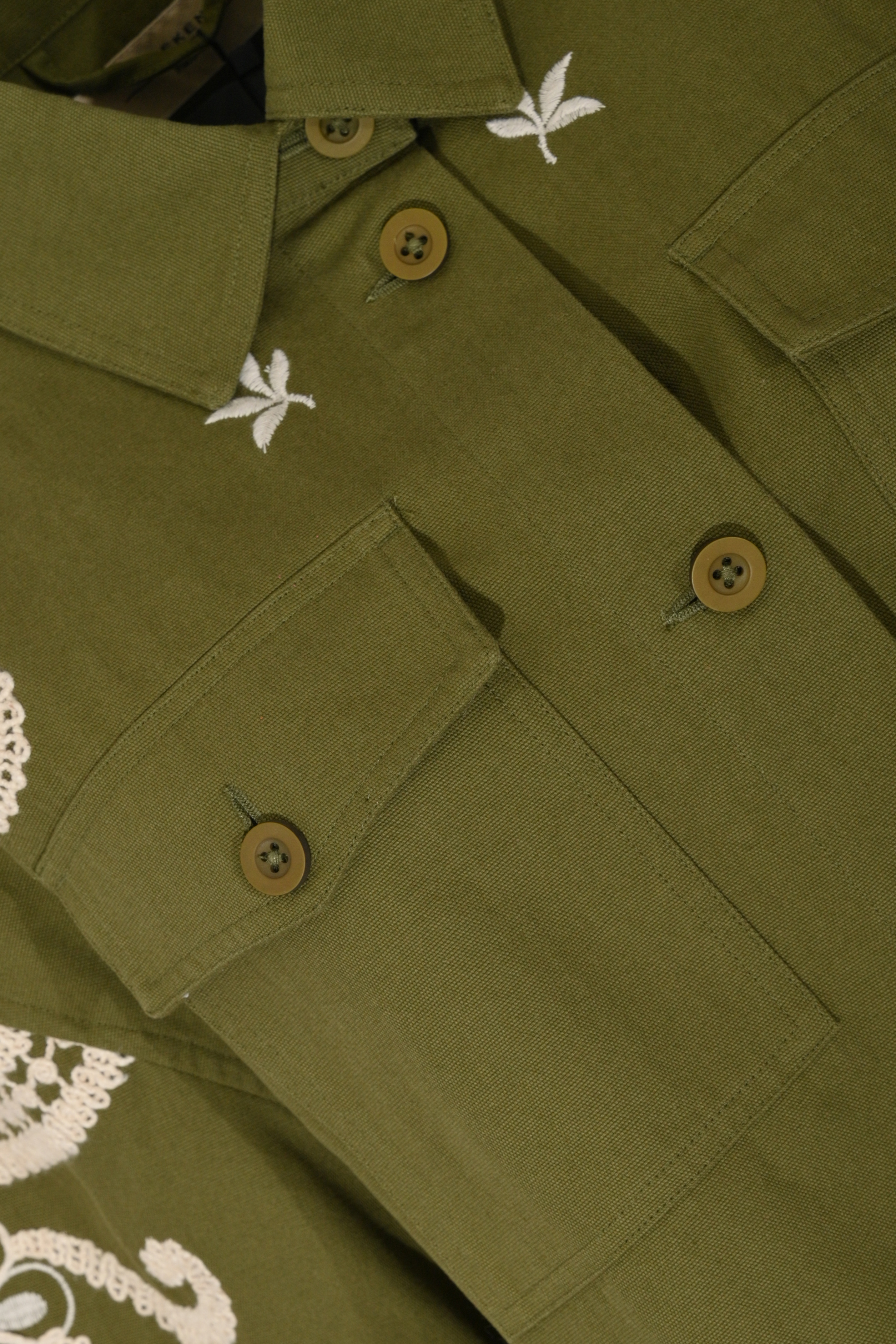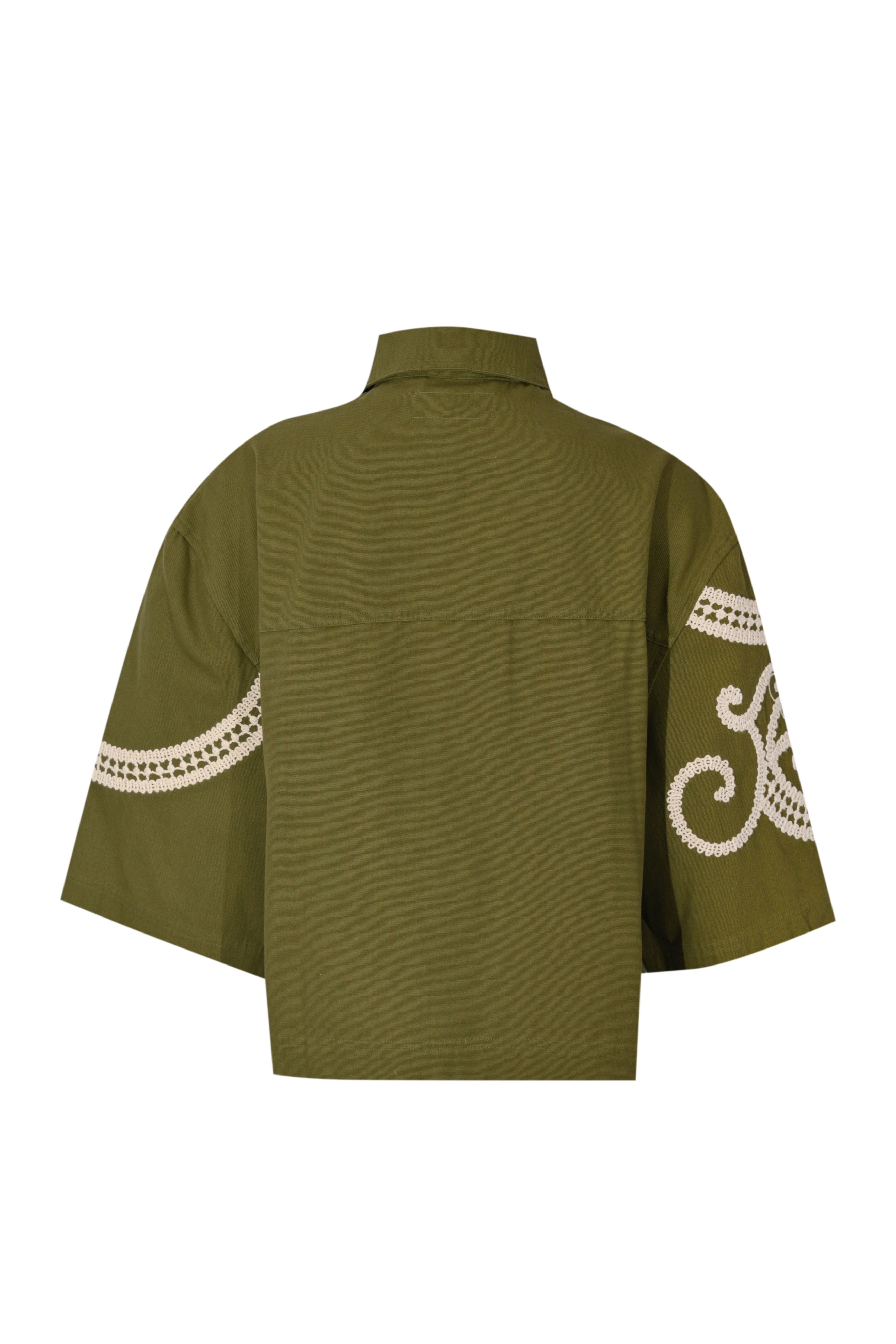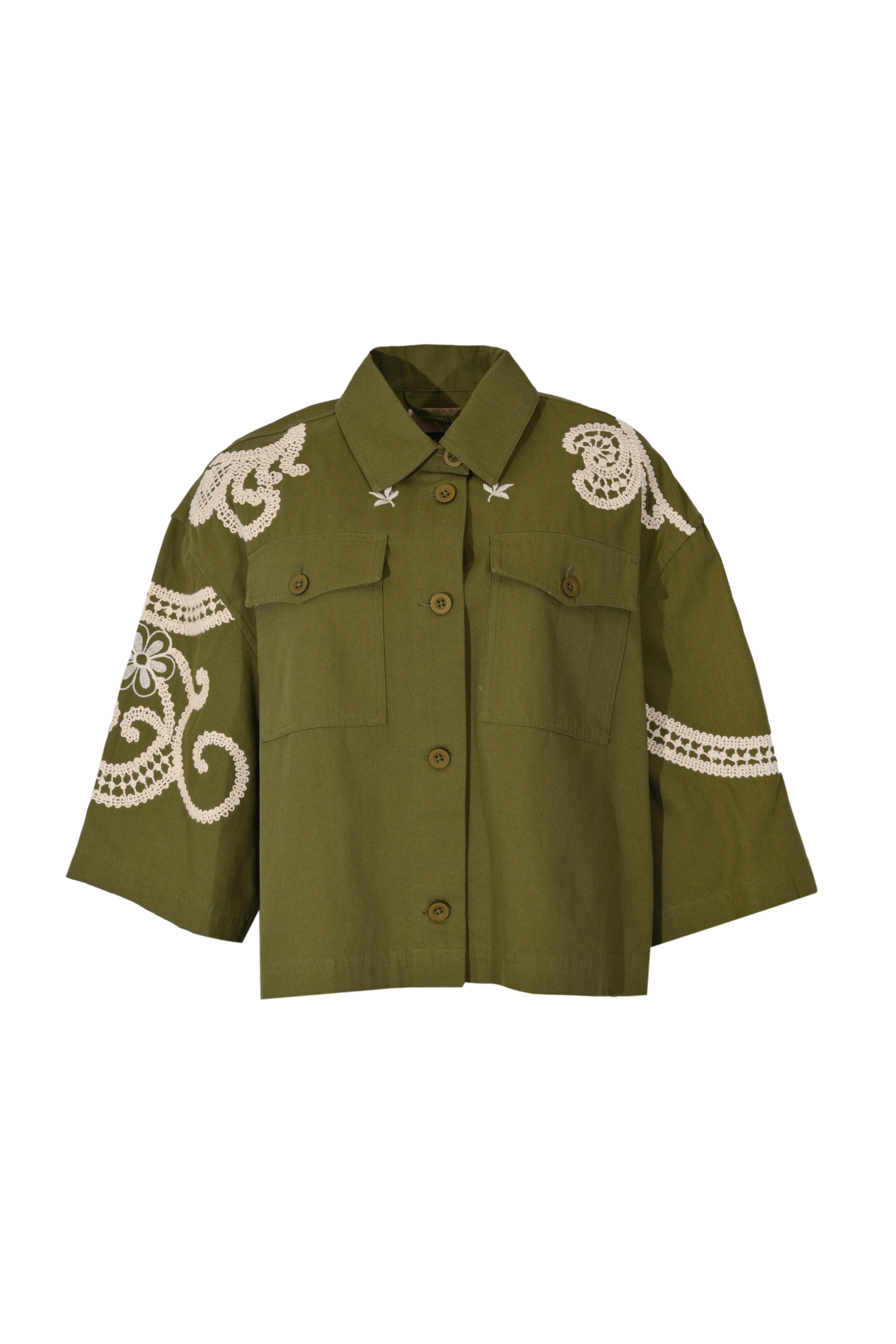 - Dettagli: ricami in stile pizzo sulle spalle e sulle maniche che creano un elegante contrasto con il tessuto, piccoli ricami frontali tono su tono, linea leggermente boxy dal gusto contemporaneo, bottoni tono su tono, costruzione ispirata al workwear rivisitata in chiave femminile, orlo dritto e struttura morbida