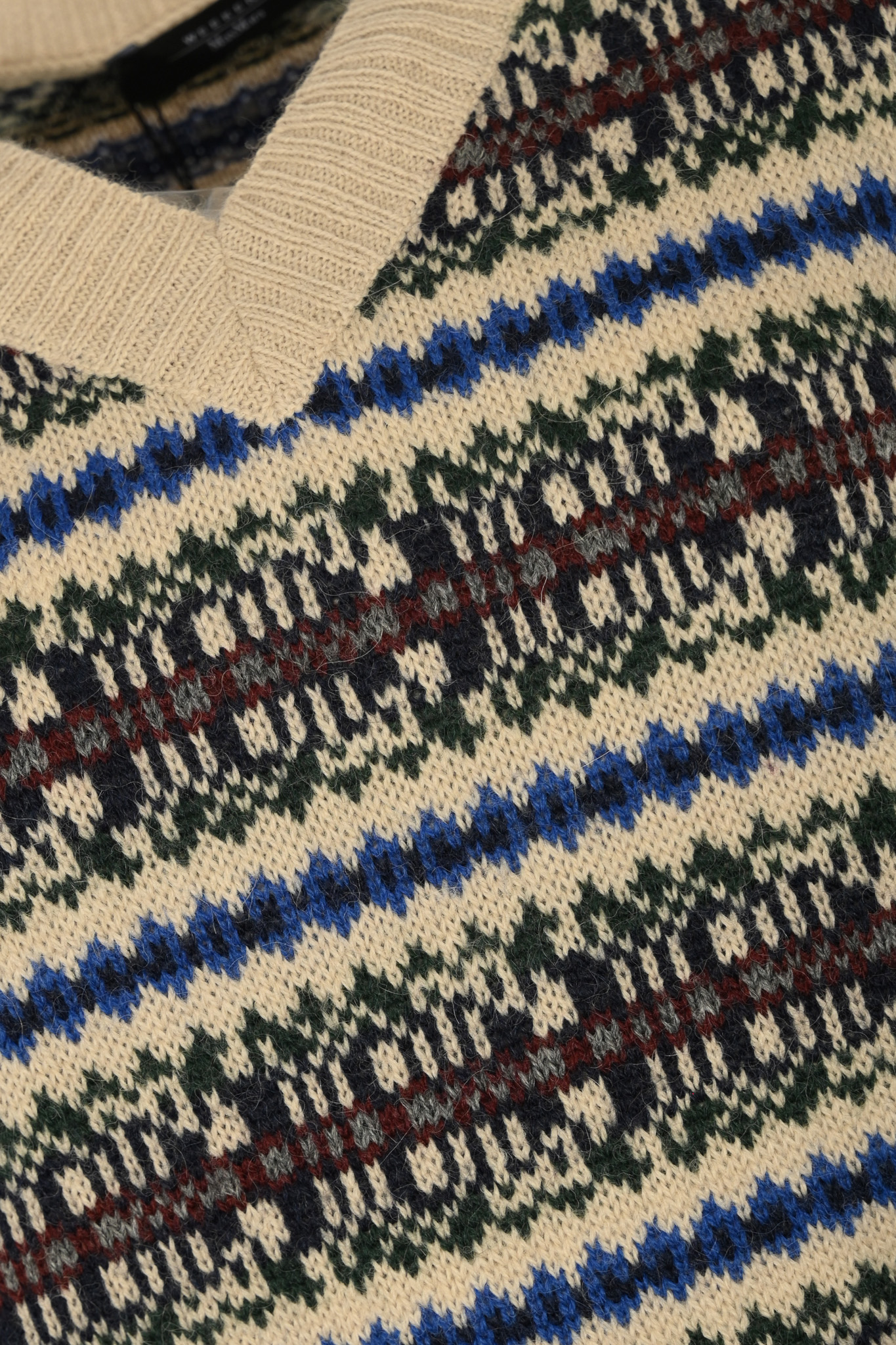 - Dettagli: lavorazione jacquard con motivi a contrasto blu, rosso e verde su fondo écru