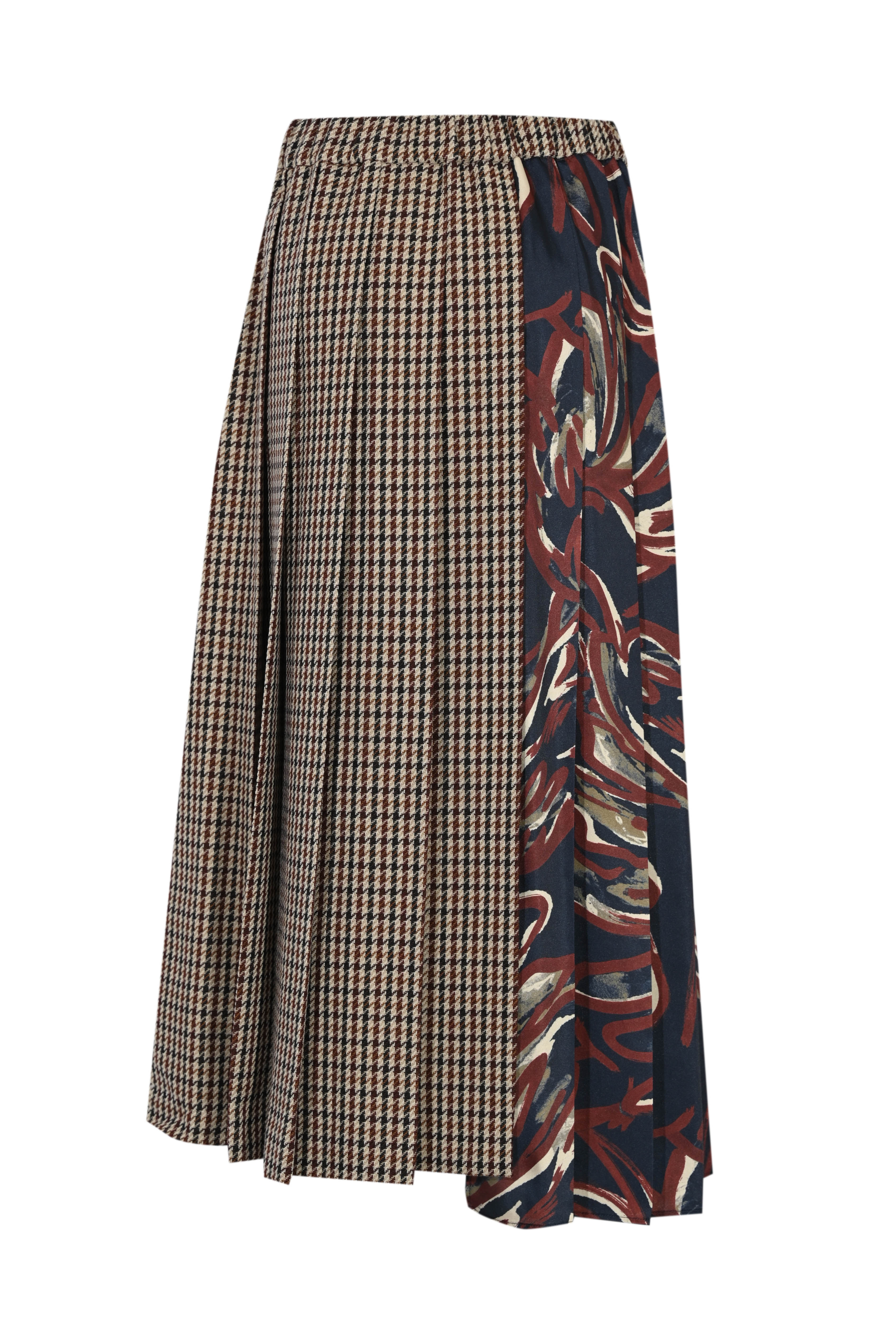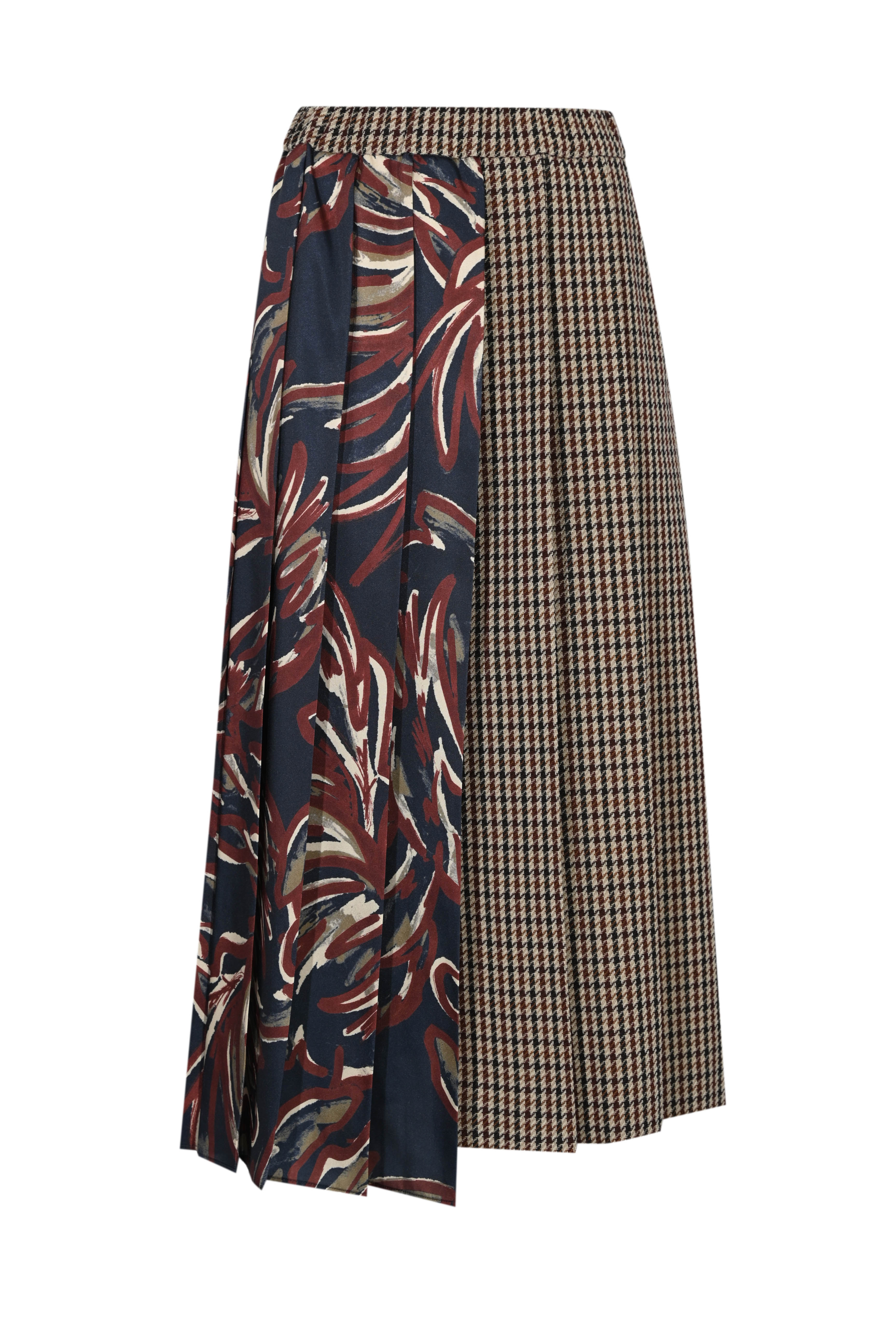 - Dettagli: costruzione a pieghe combinate, effetto patchwork tra tessuto gessato e stampato, orlo regolare