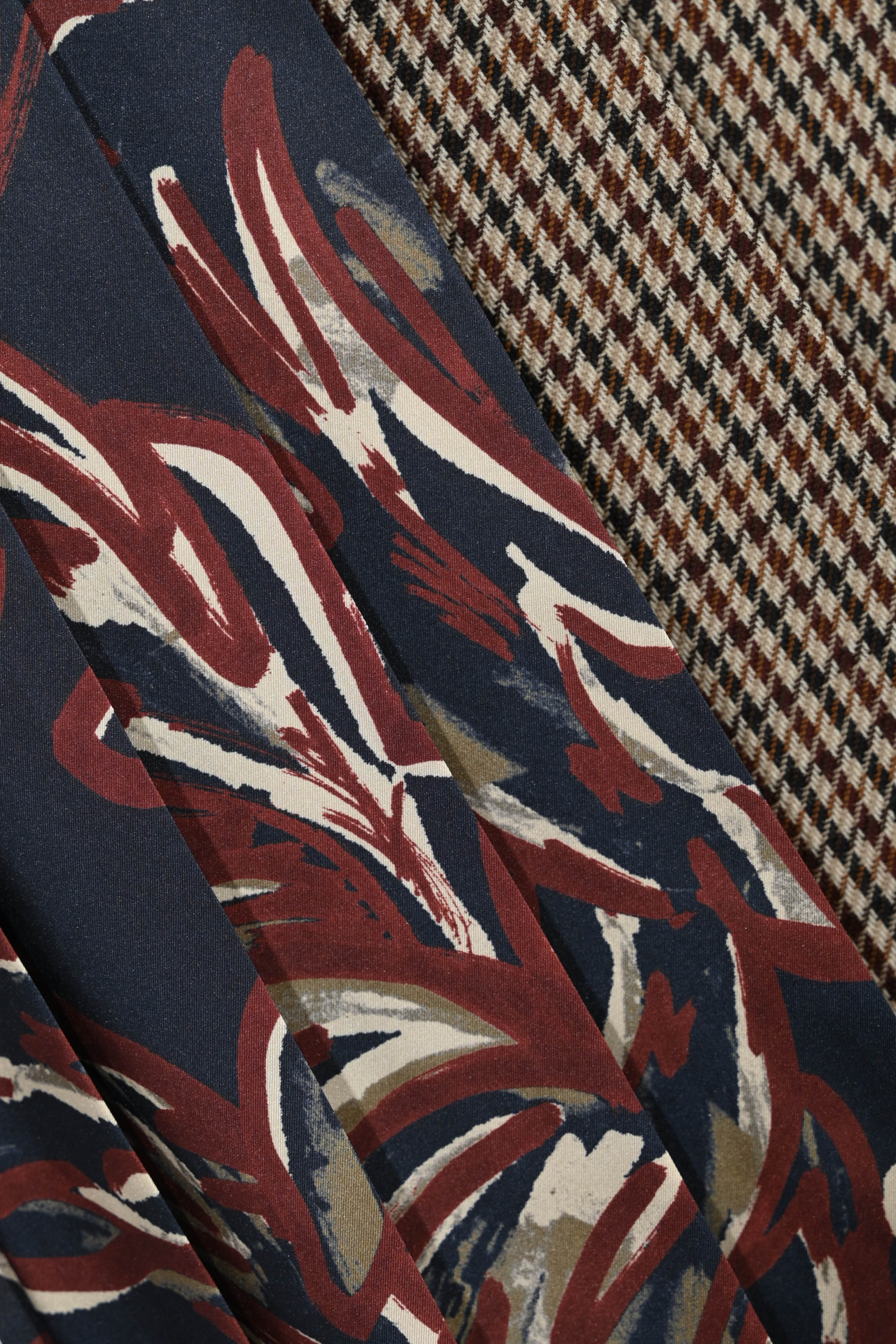 - Fantasia: pied de poule con pannello a fantasia astratta nei toni del bordeaux, blu e sabbia