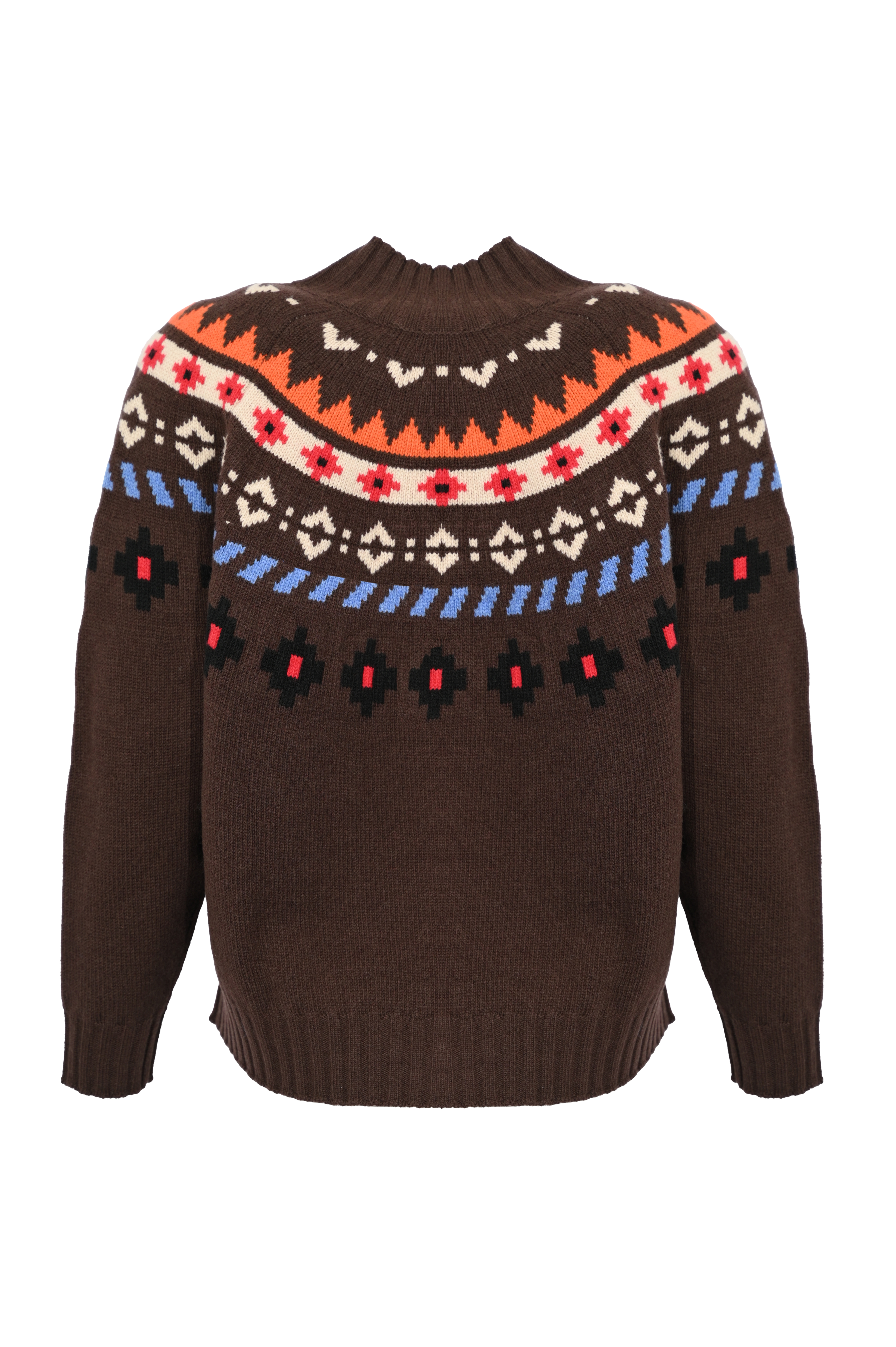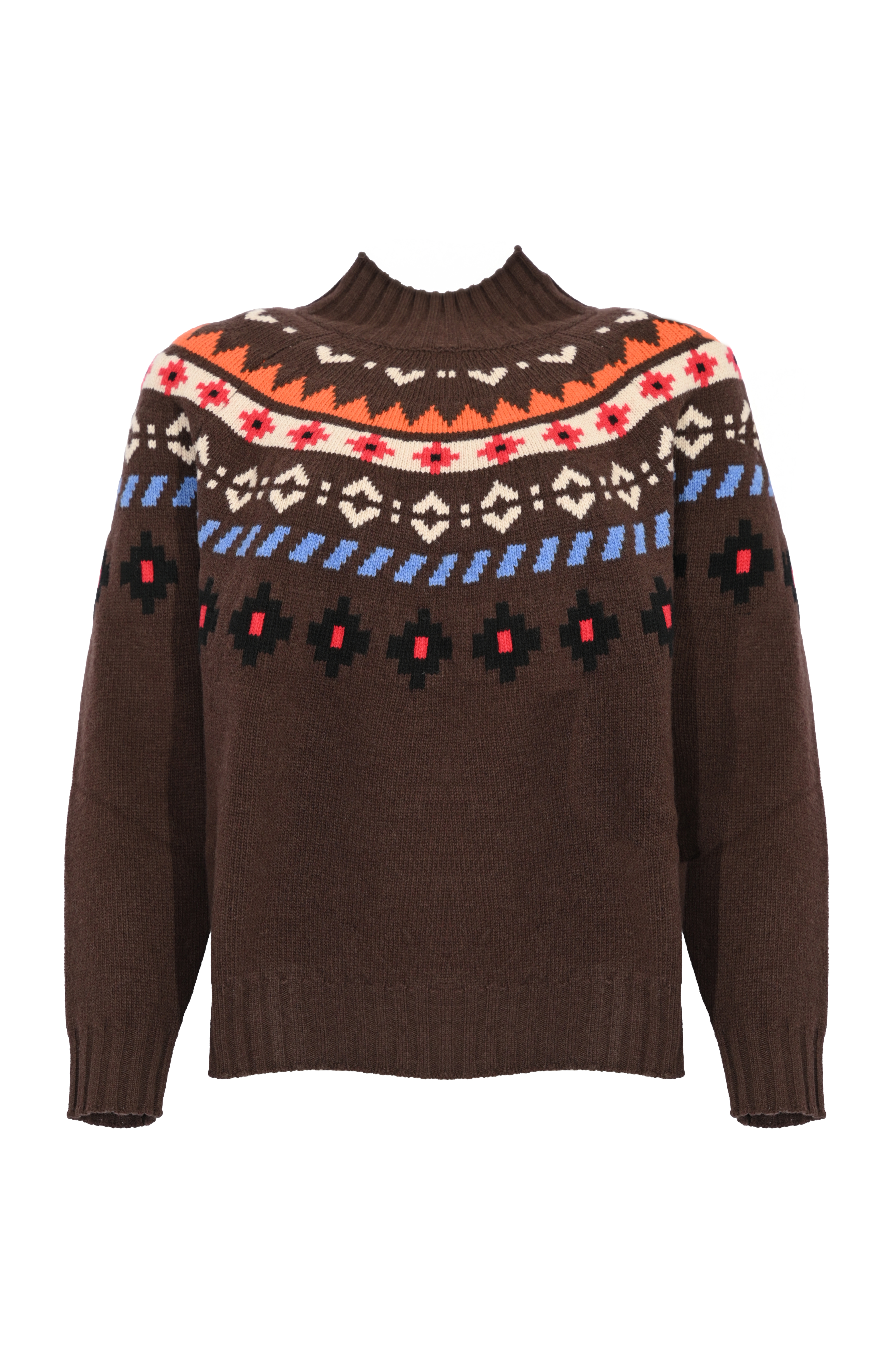 - Dettagli: lavorazione jacquard multicolor, bordi a costine su collo, polsini e fondo, struttura morbida e calda