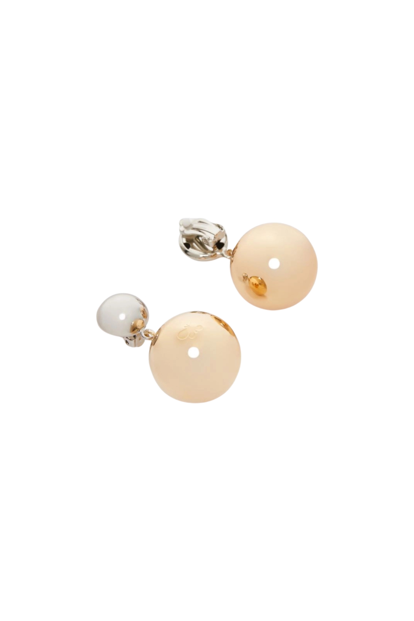 - Dettagli: design Pasticcino Bag con doppia sfera, elemento superiore bianco effetto perlato e pendente con sfera grande dorata satinata incisa con logo, collegamento con piccolo snodo metallico che permette movimento