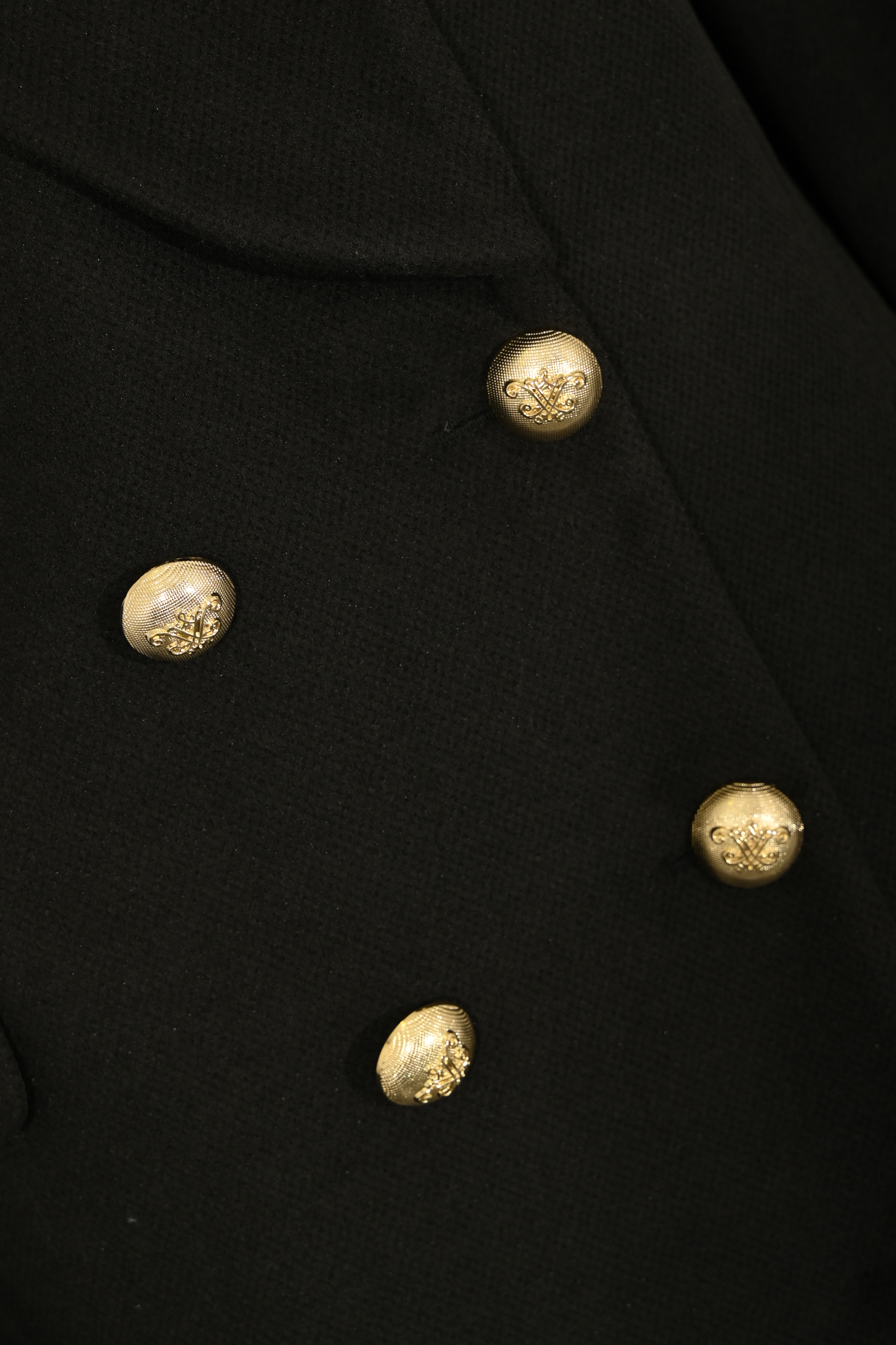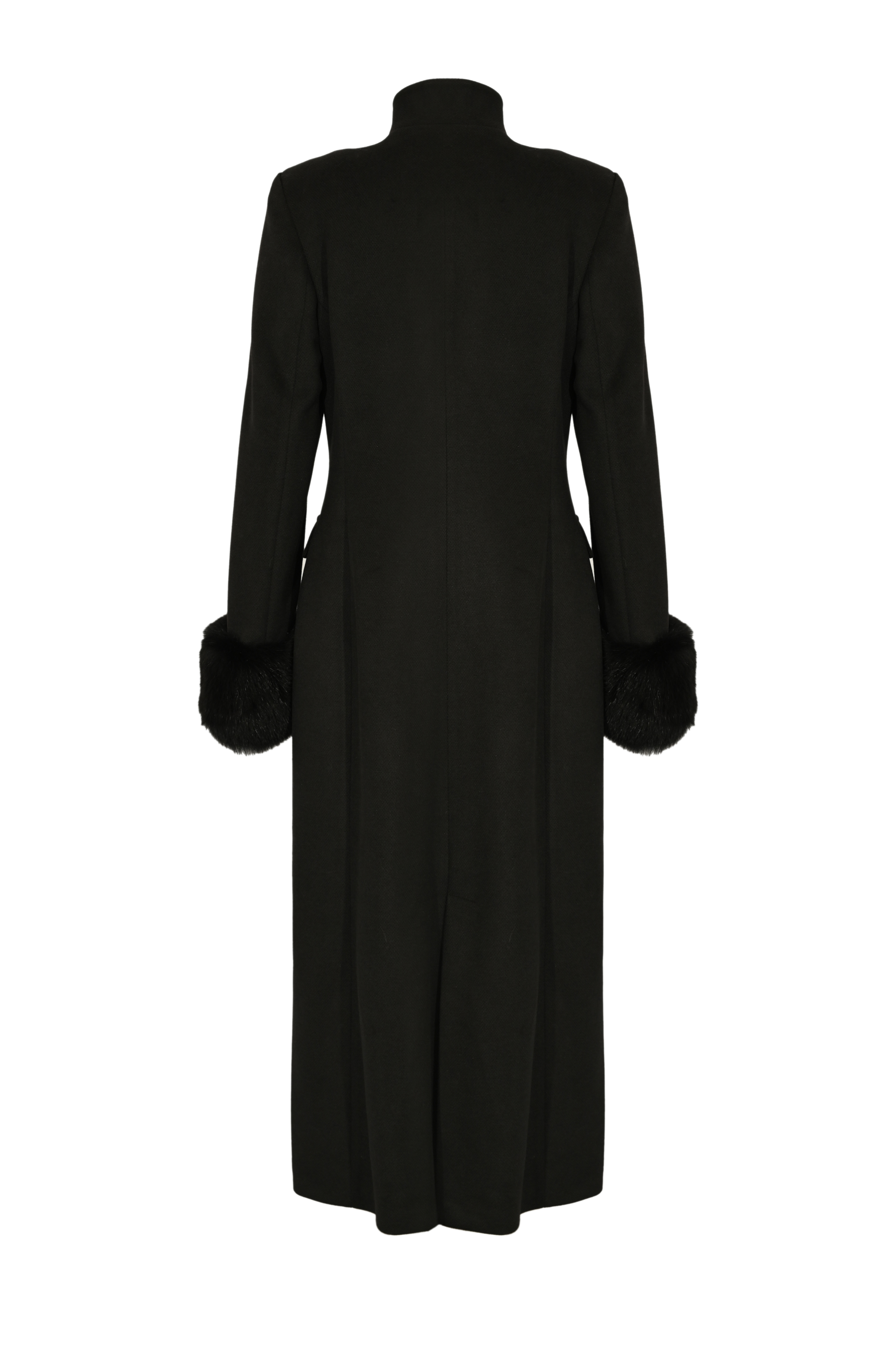 - Dettagli: bottoni metallici dorati con motivo decorativo, inserti in pelliccia di volpe sui polsini, taglio sfiancato, lunghezza midi, stile elegante e raffinato